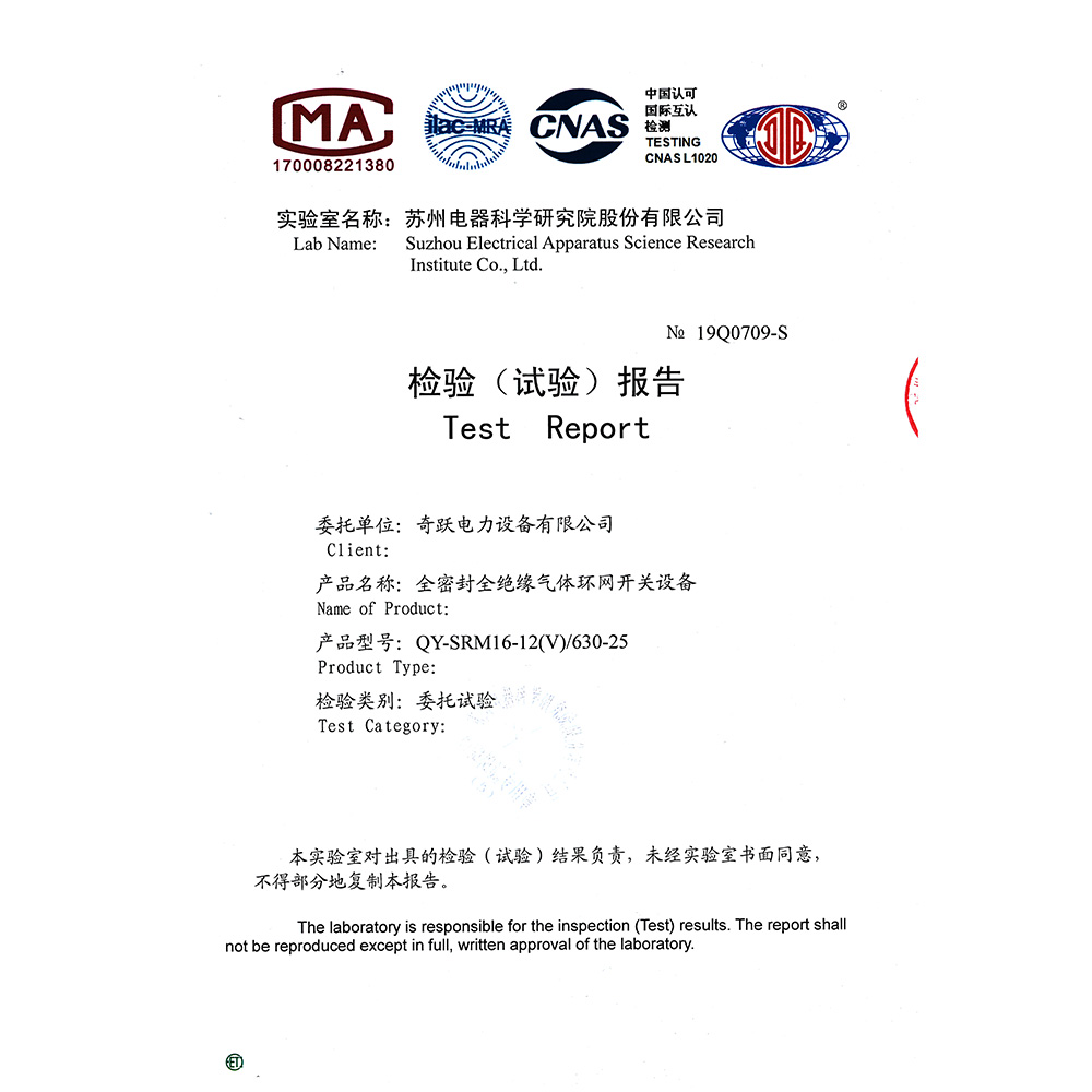 QY-SRM16-12(V)/630-25全密封全绝缘气体环网开关设备 检验报告