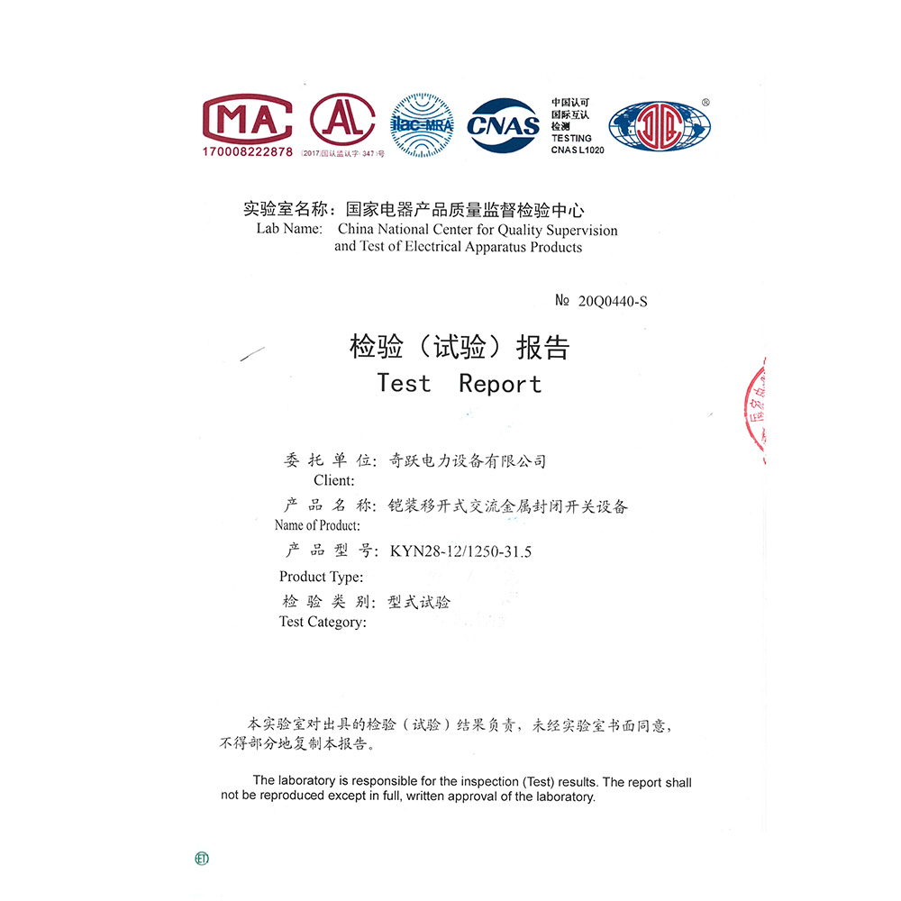 KYN28-12/1250-31.5铠装移开式交流金属封闭开关设备 检验报告