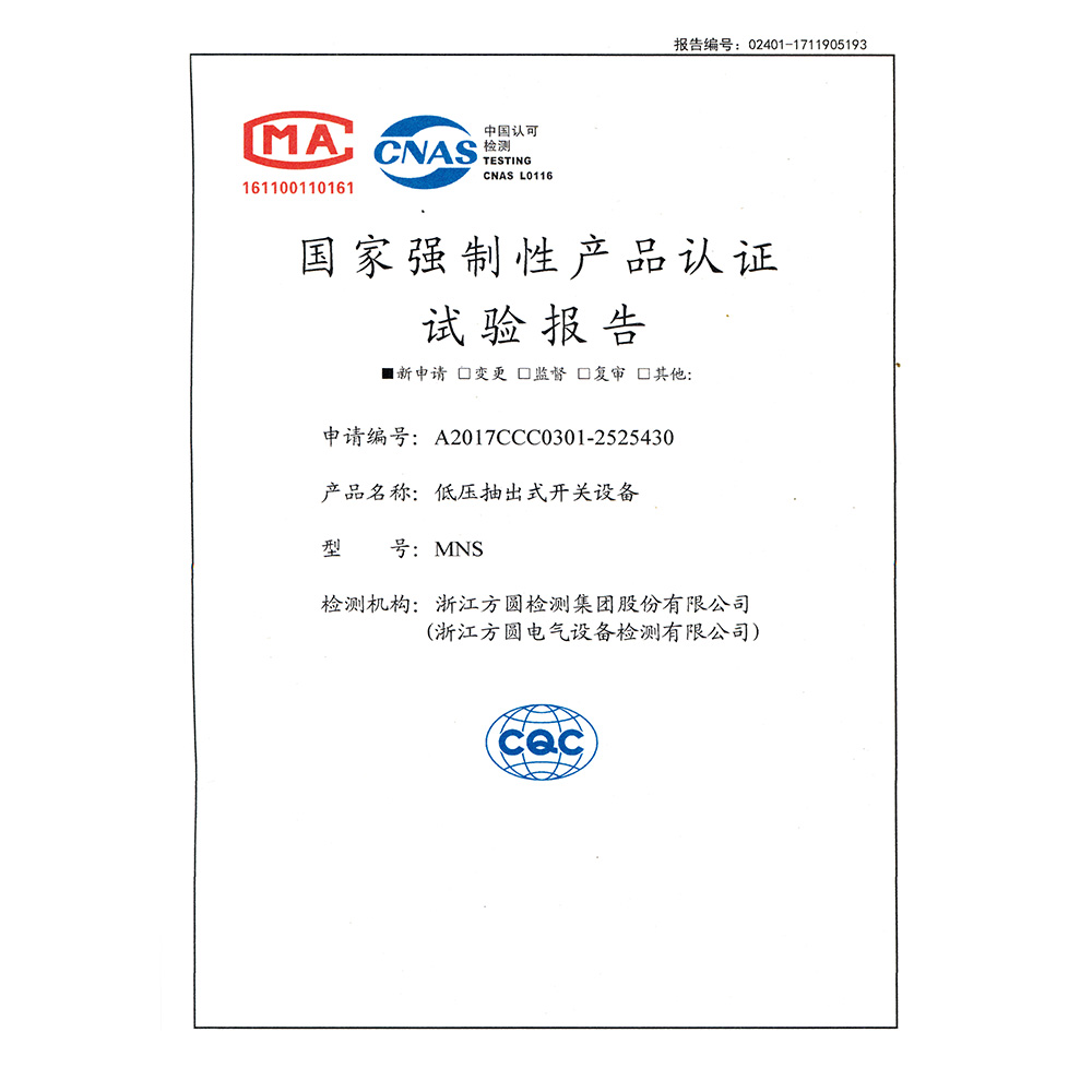 MNS低压抽出式开关设备 检验报告